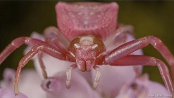 Bazı yengeç örümcekleri avlarını beklerken saklandıkları yerin rengini alabiliyor. Fotoğraftaki örümcek de üzerinde bulunduğu süpürge otu çiçeğinin pembe rengine bürünmüş.