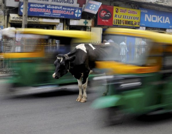 Yol ortasındaki trafiğe aldırış etmeden kendi halinde dolaşan inek Bengaluru / Hindistan